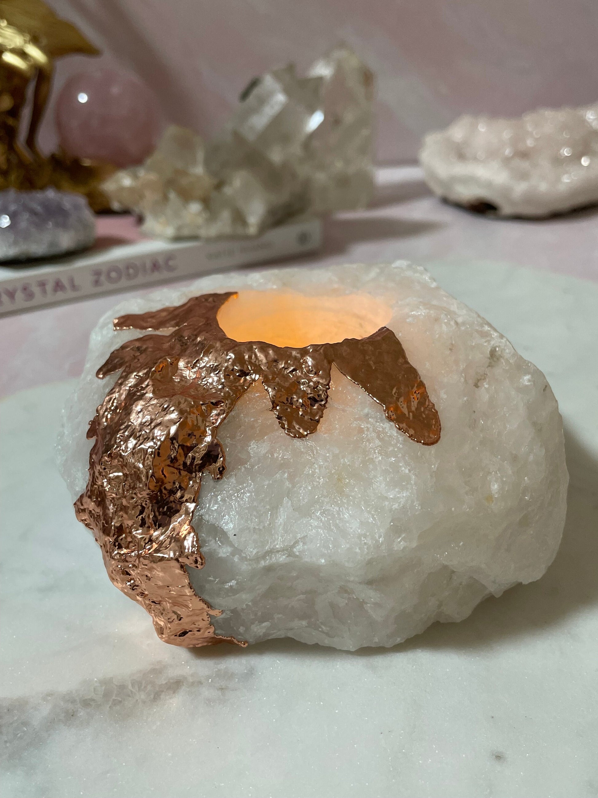 Beautiful natural quartz tea light holder from Brazil with copper plating. Beautiful decor piece.