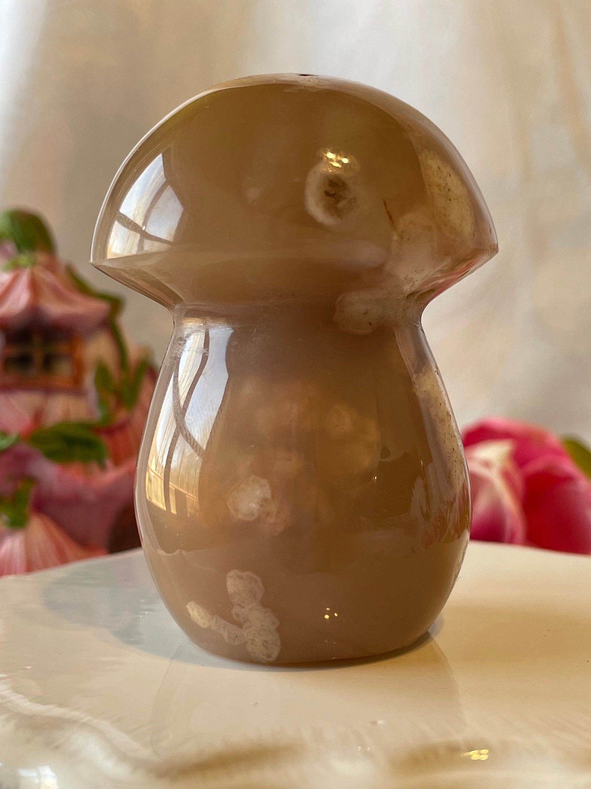 Flower Agate was discovered in 2018 in Madagascar. It is a translucent crystal made from agate with opaque inclusions of chalcedony that often resemble flowers, hence its name. It can be found most often in shades of light pink but can include shades of red, brown and green with white formations.
