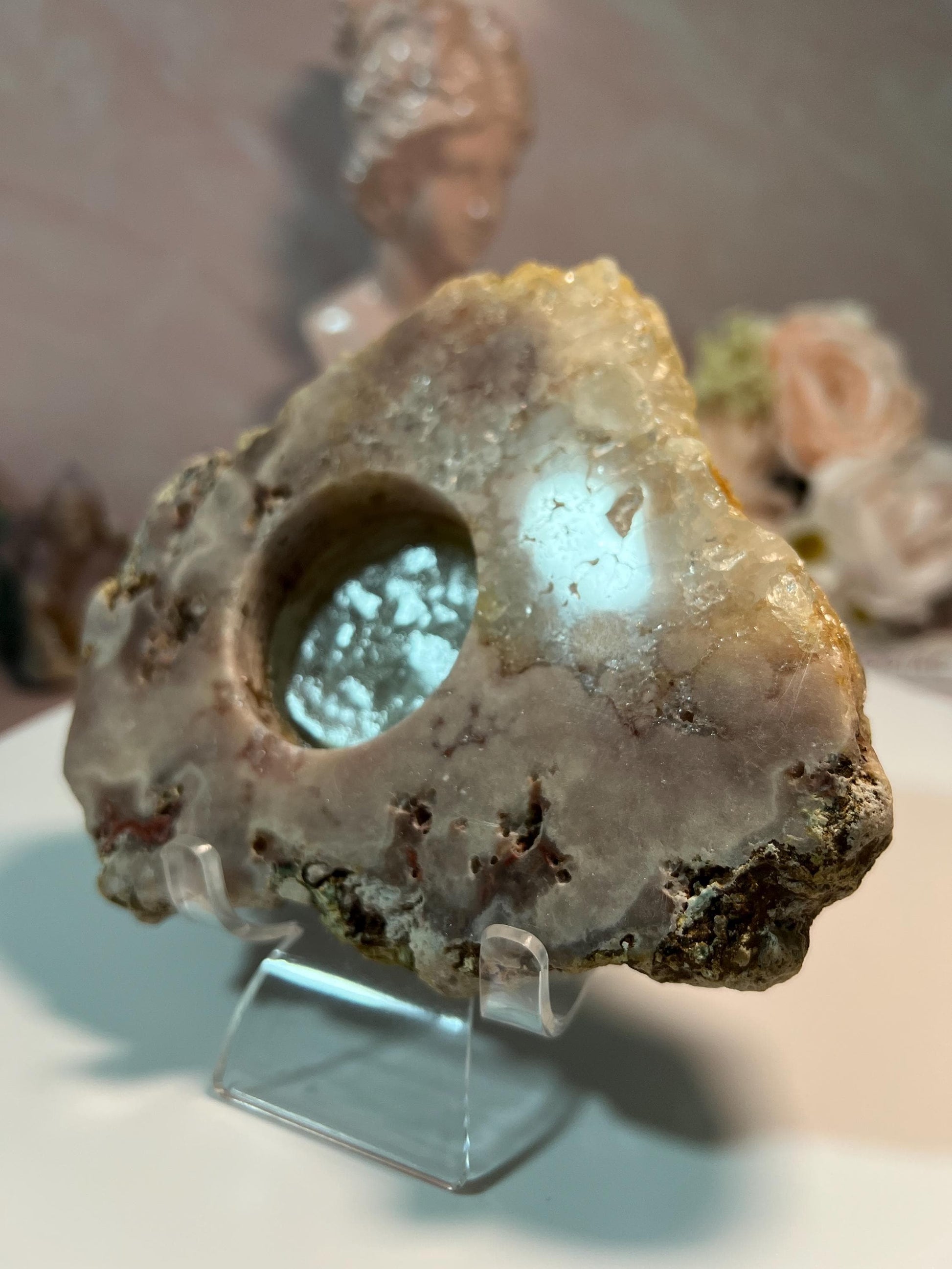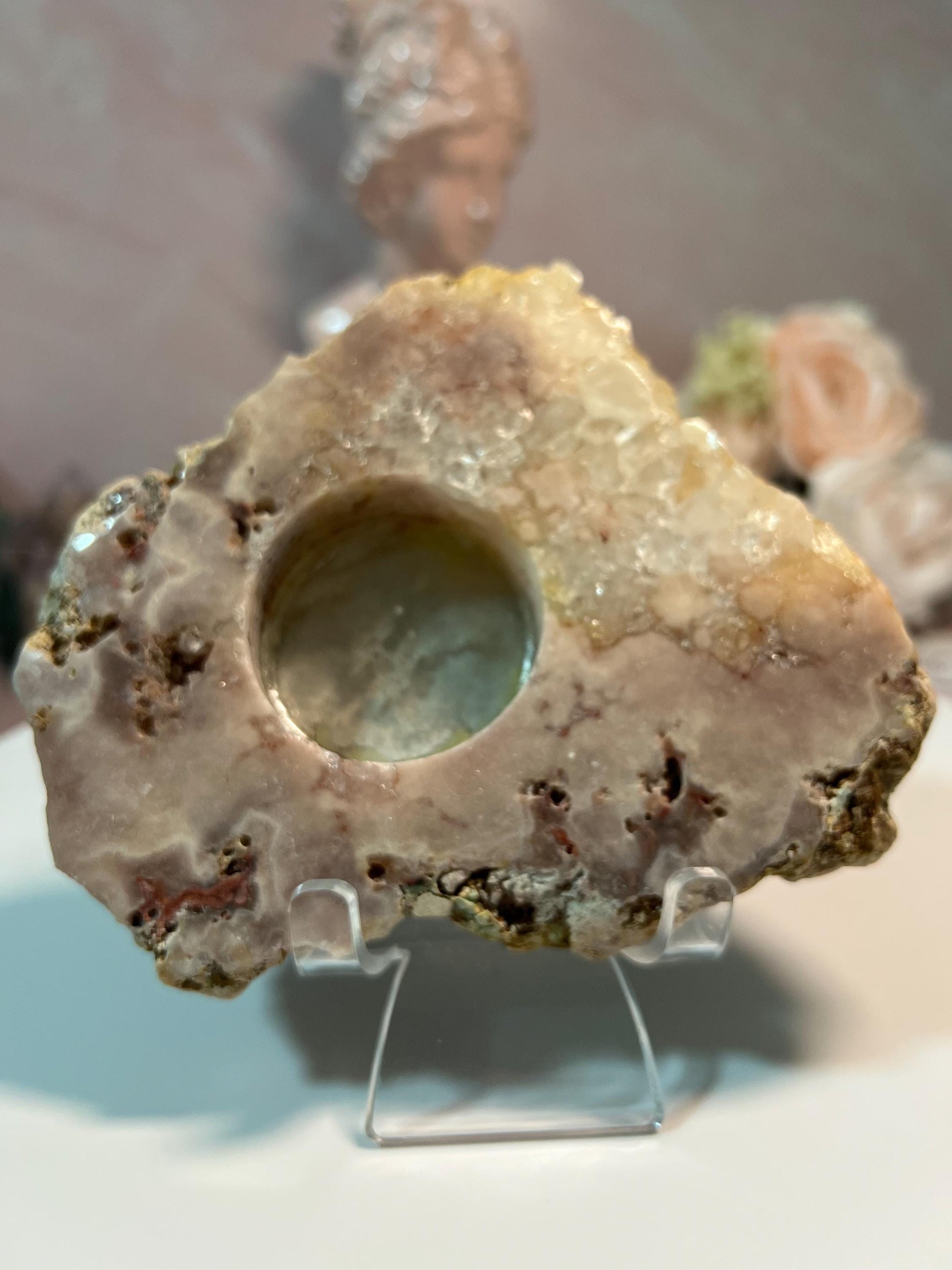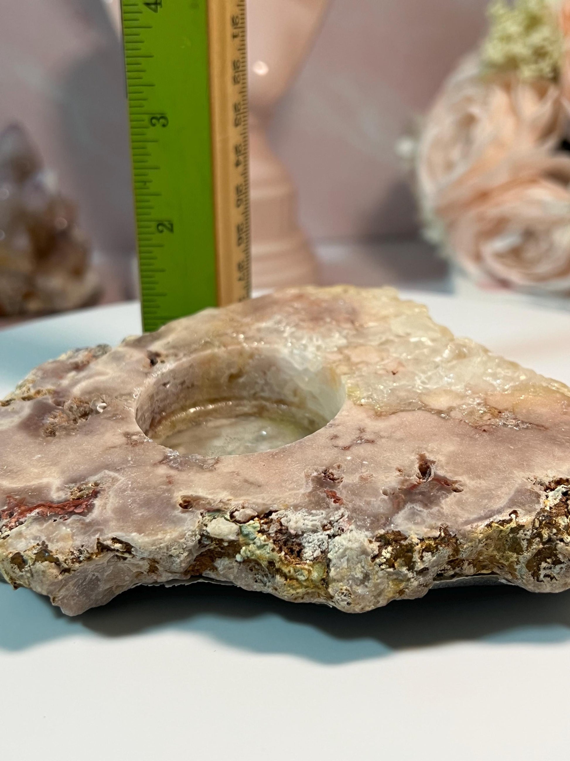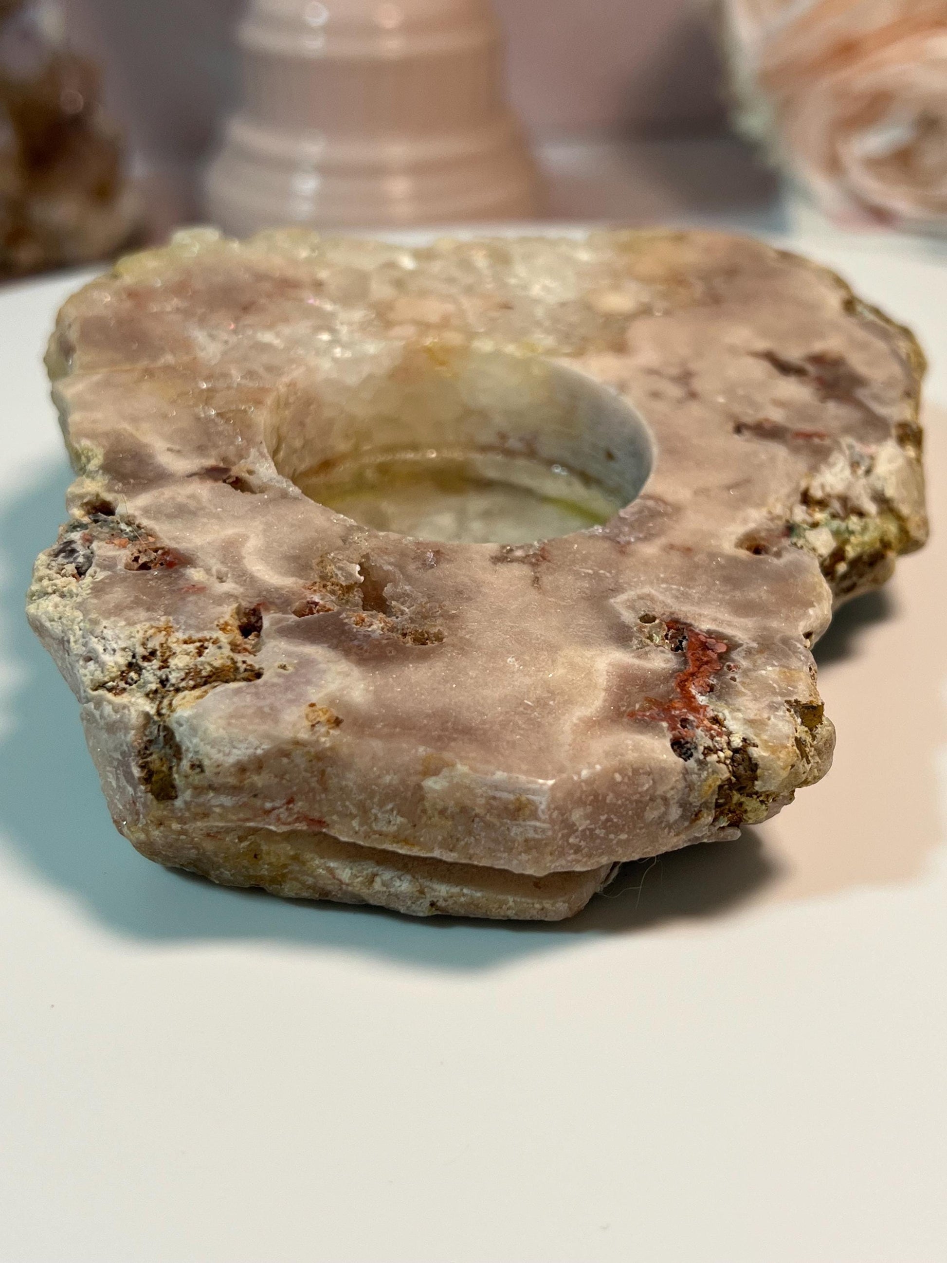 Disclaimer: This pink amethyst candle holder does not lay flat. It tilts a little to one side.