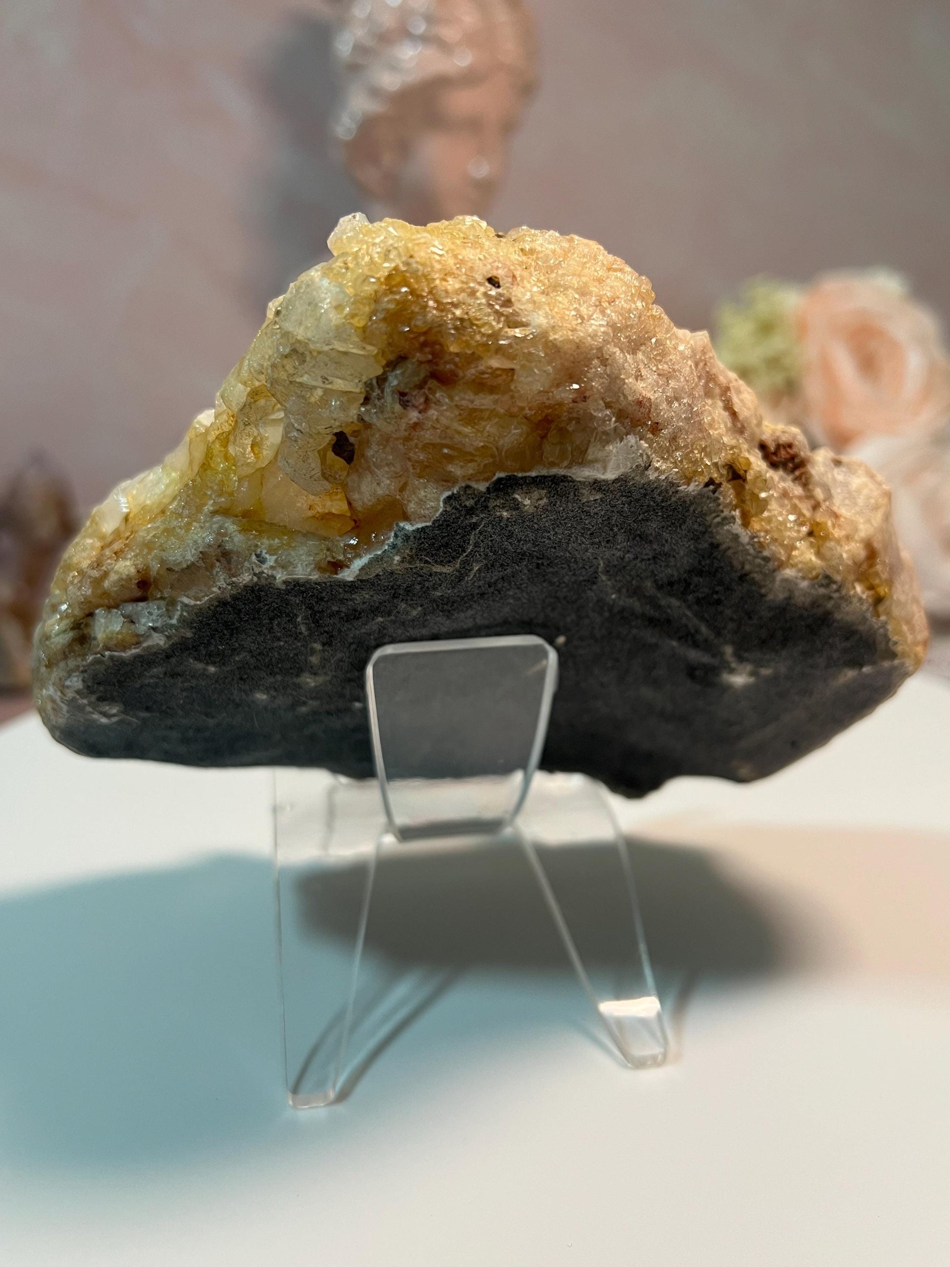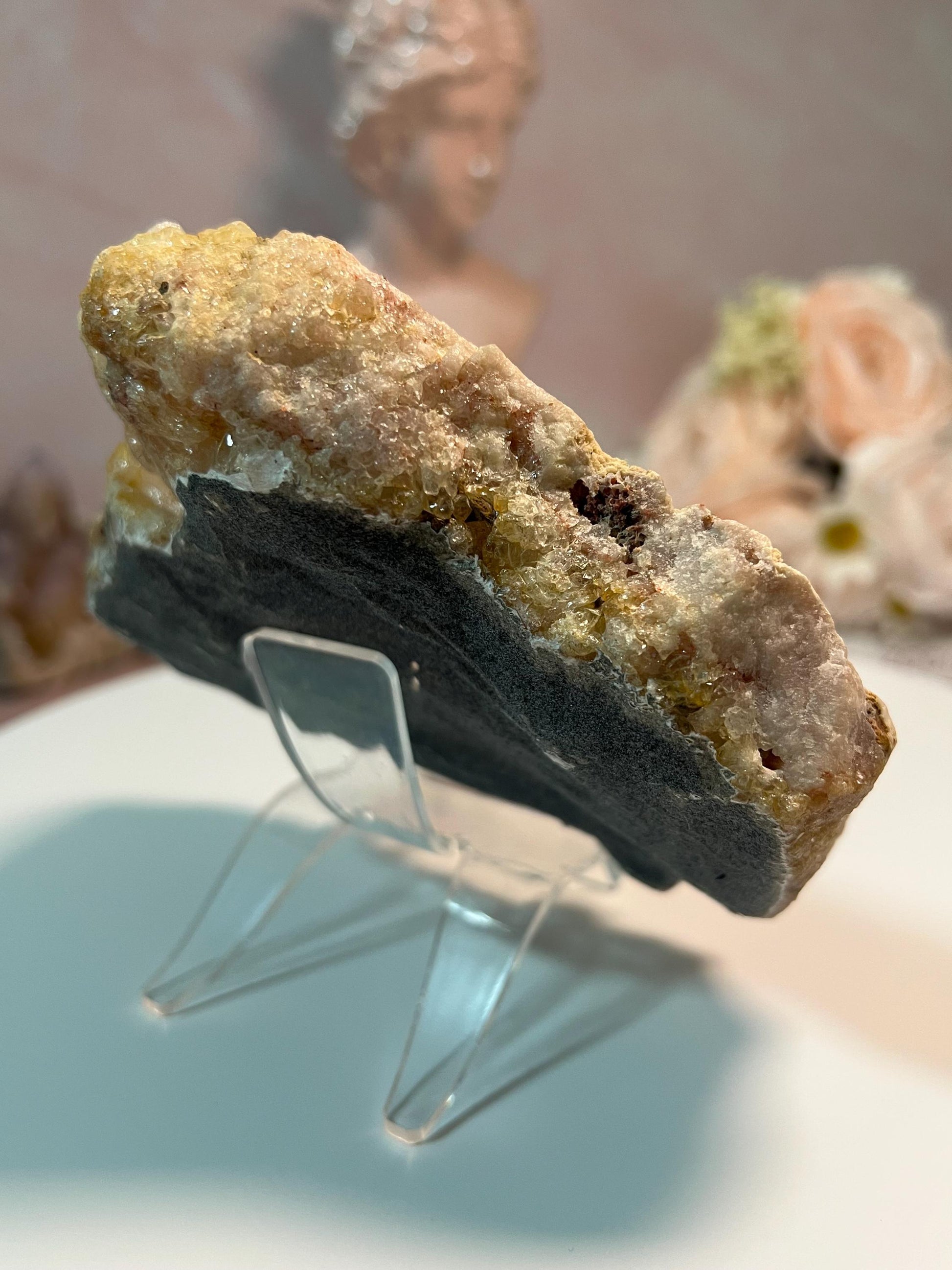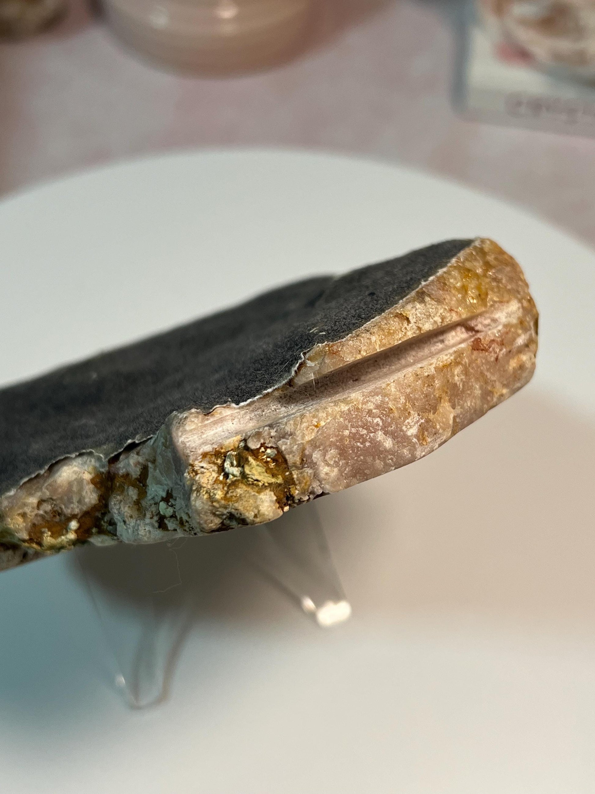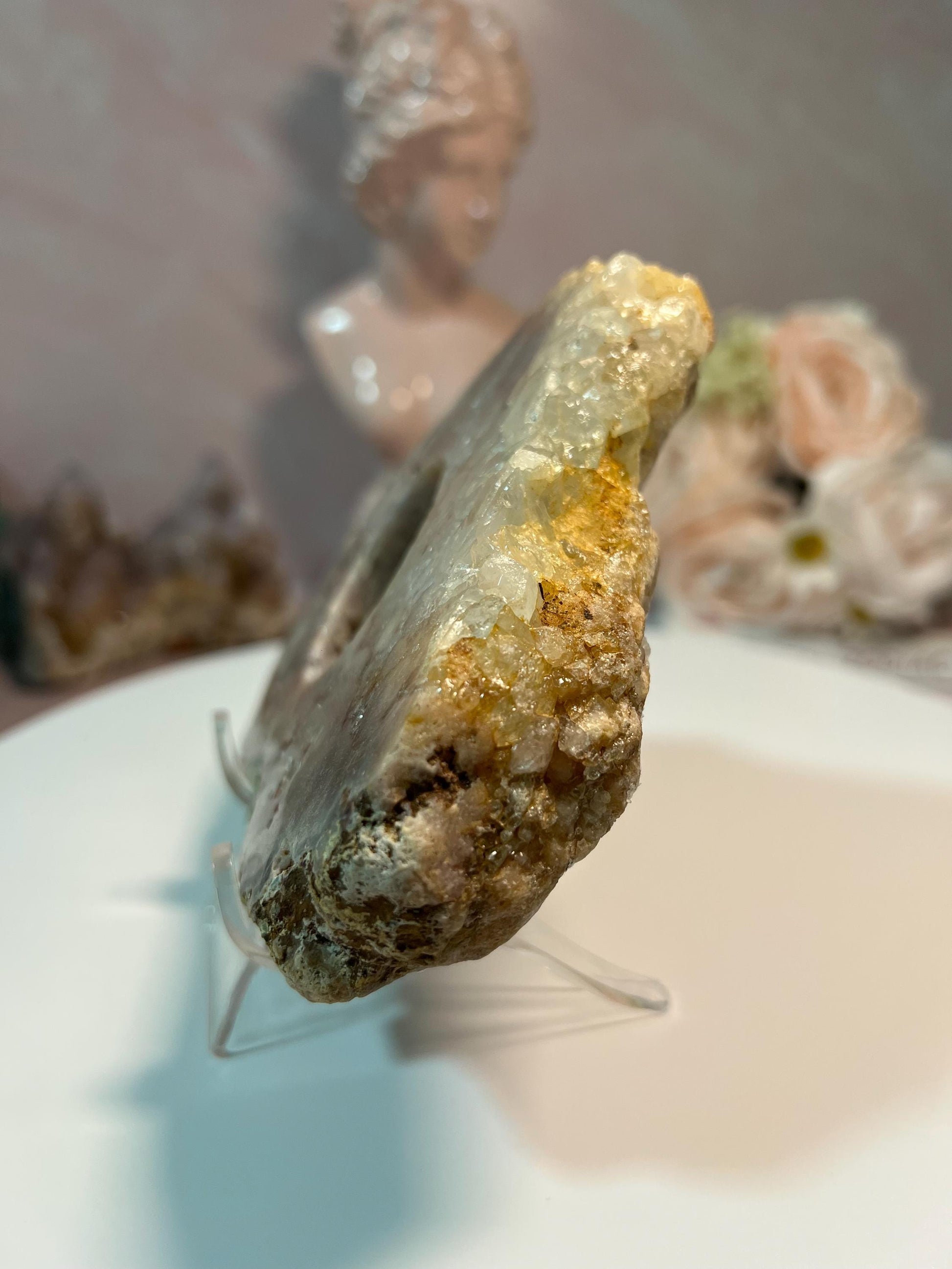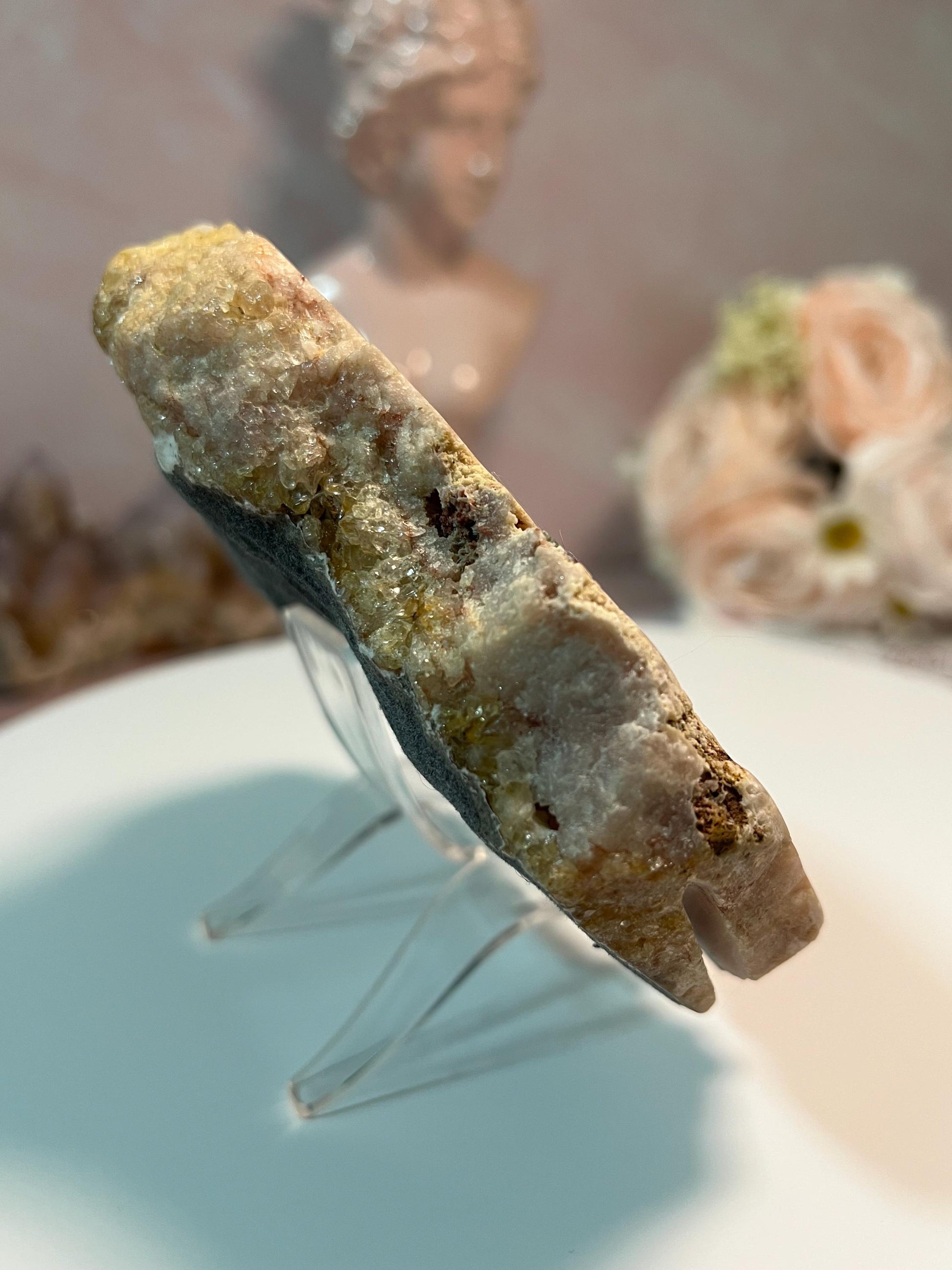 Disclaimer: This pink amethyst candle holder does not lay flat. It tilts a little to one side.