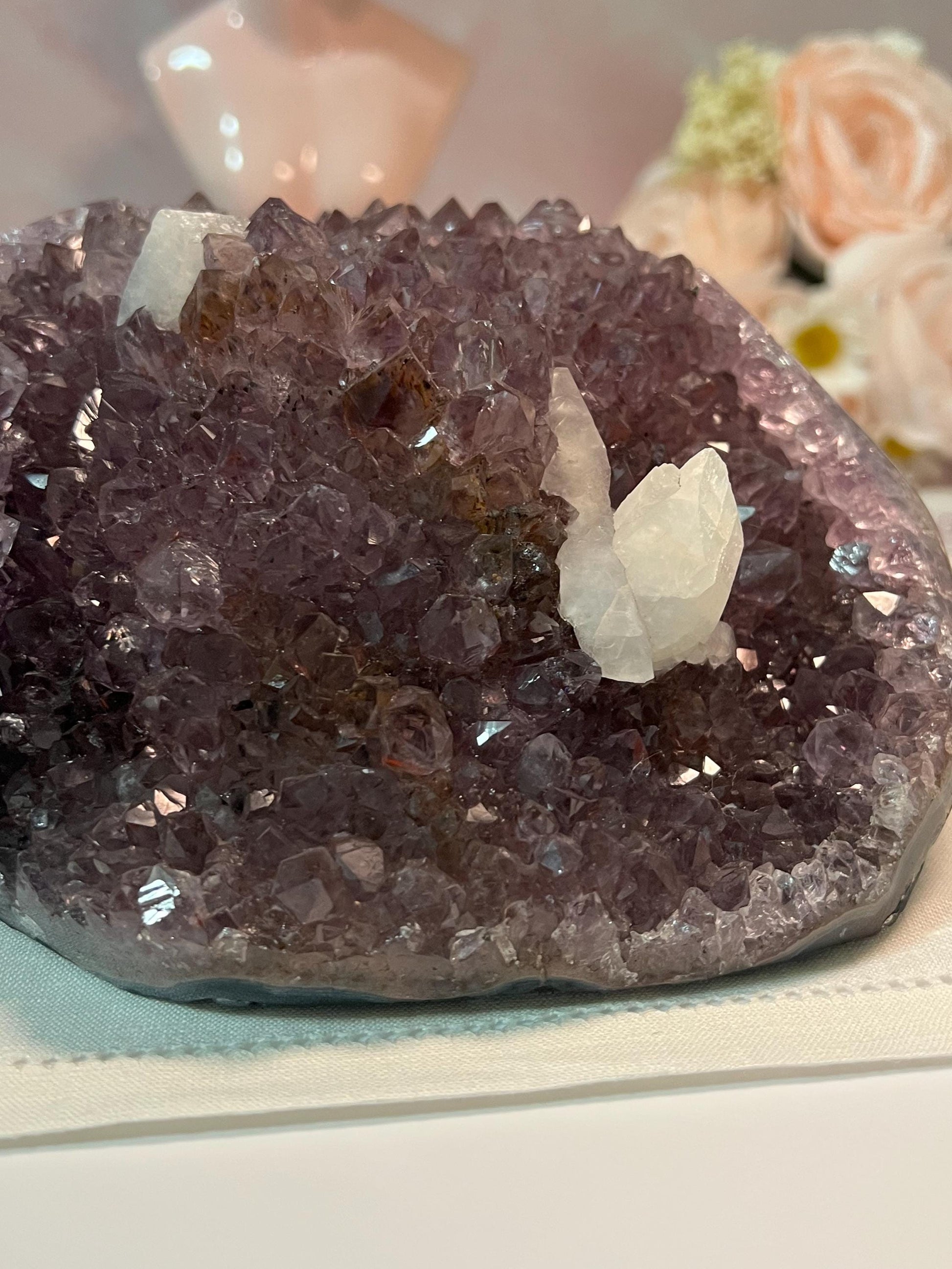 โจ๐ฎโจ Discover the mesmerizing beauty of this gorgeous amethyst formation intertwined with calcite! ๐โจ These stunning crystals not only captivate the eye but also carry powerful energies. Amethyst is known for its calming properties, while calcite brings clarity and vitality. Together, they create a harmonious balance that can enhance your space and spirit!